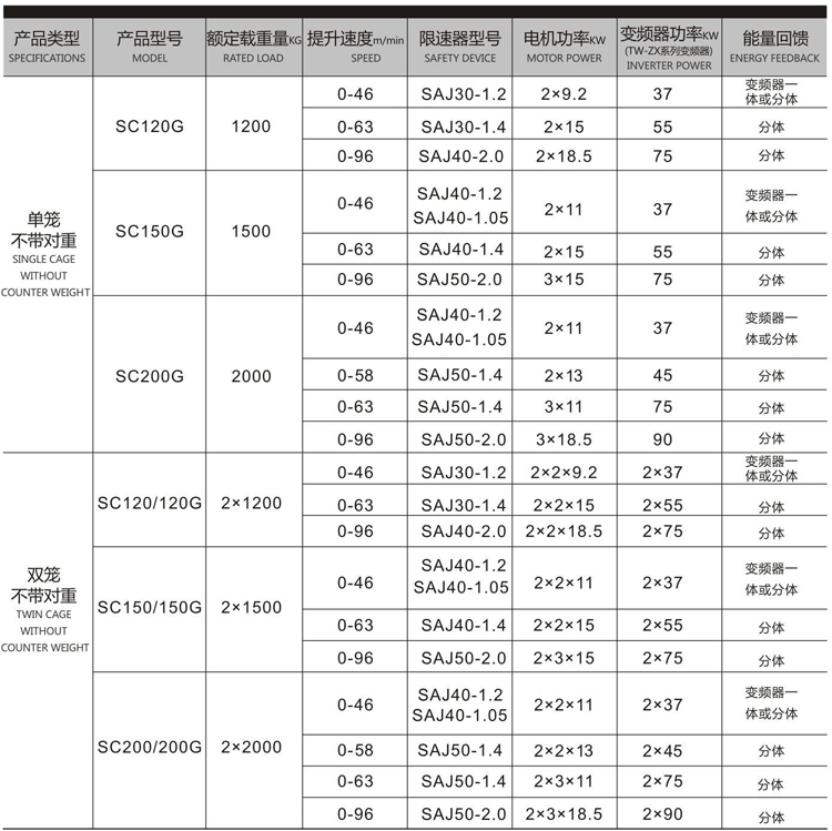 SC系列變頻綠色環(huán)保型升降機(jī) 額定速度:0-46、0-58、0-63、0-96米/分鐘 SC系列變頻綠色環(huán)保型升降機(jī)除擁有變頻升降機(jī)的特點(diǎn)外,升降機(jī)在下降時(shí)通過能量回饋系統(tǒng)將安全、干凈的電能回饋到內(nèi)部電網(wǎng),供設(shè)備使用,升降機(jī)下降時(shí)回饋電能能達(dá)到上升時(shí)所耗電能的50%。